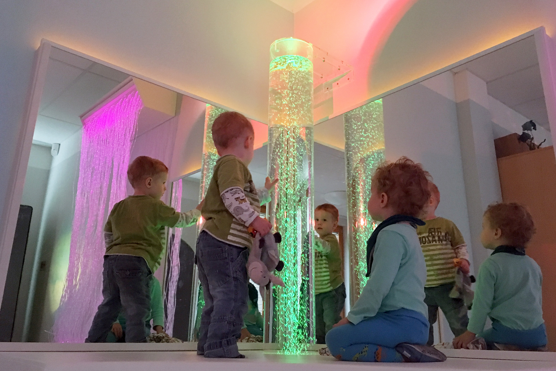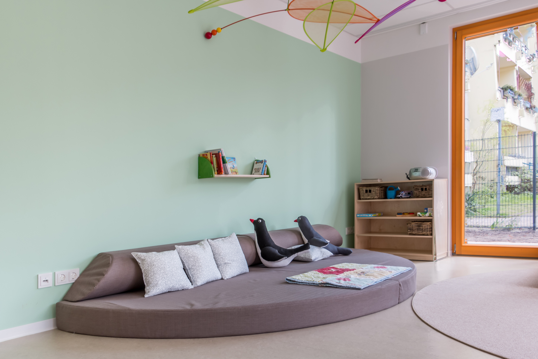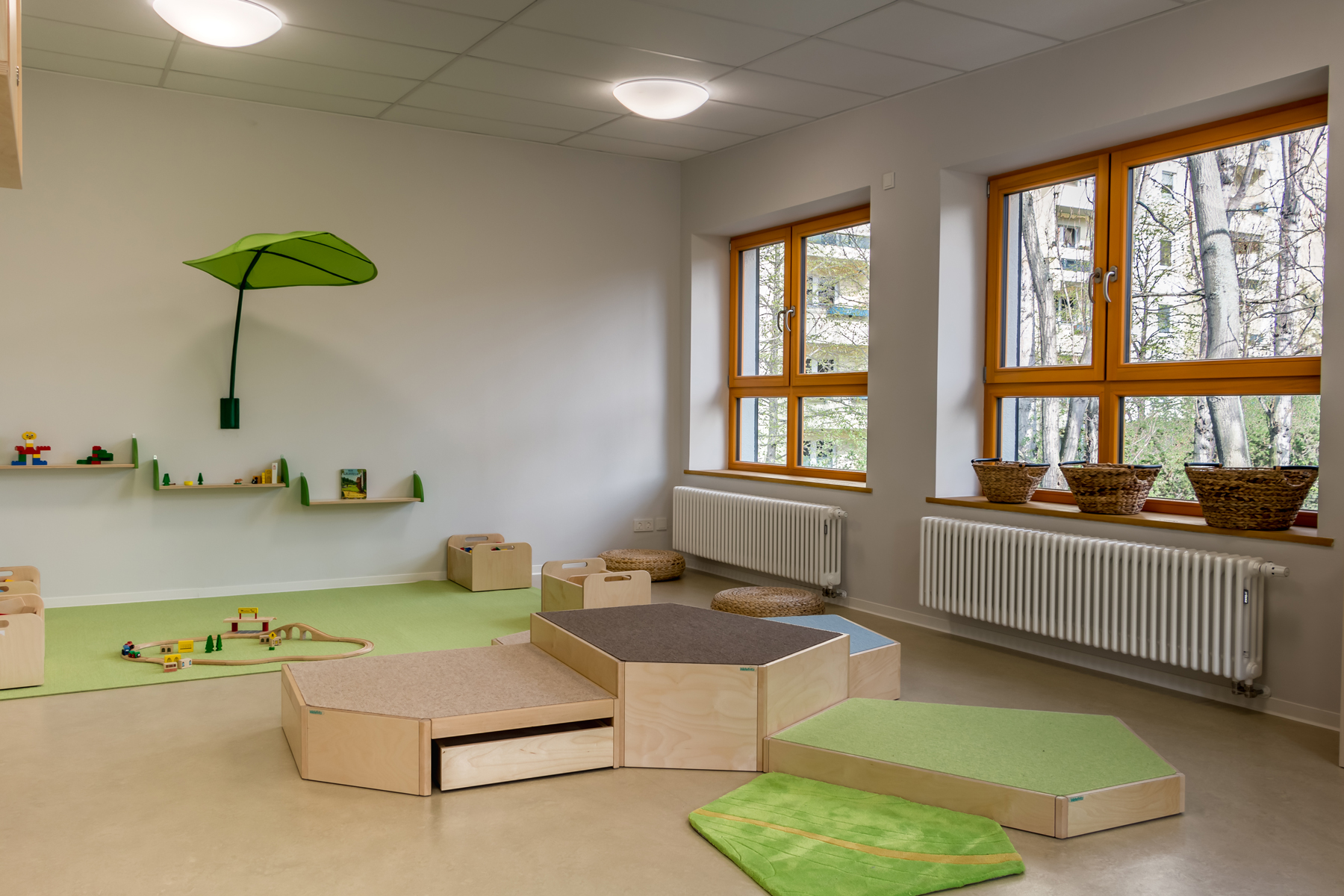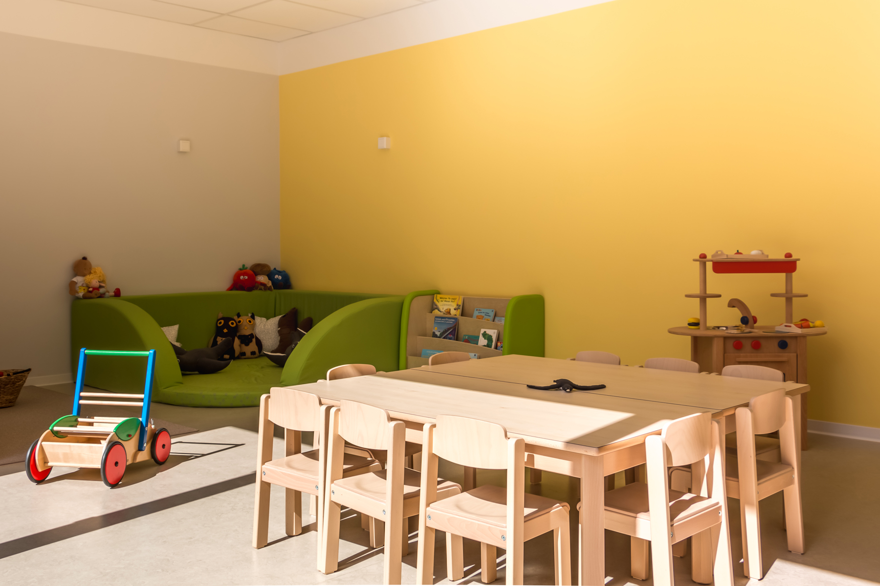 • multifunktionale Gruppenräume mit diversen Schwerpunkten: Ruhe und Rückzug, Sehen/Fühlen/Erfahren, Rollenspiele, Sprach- und