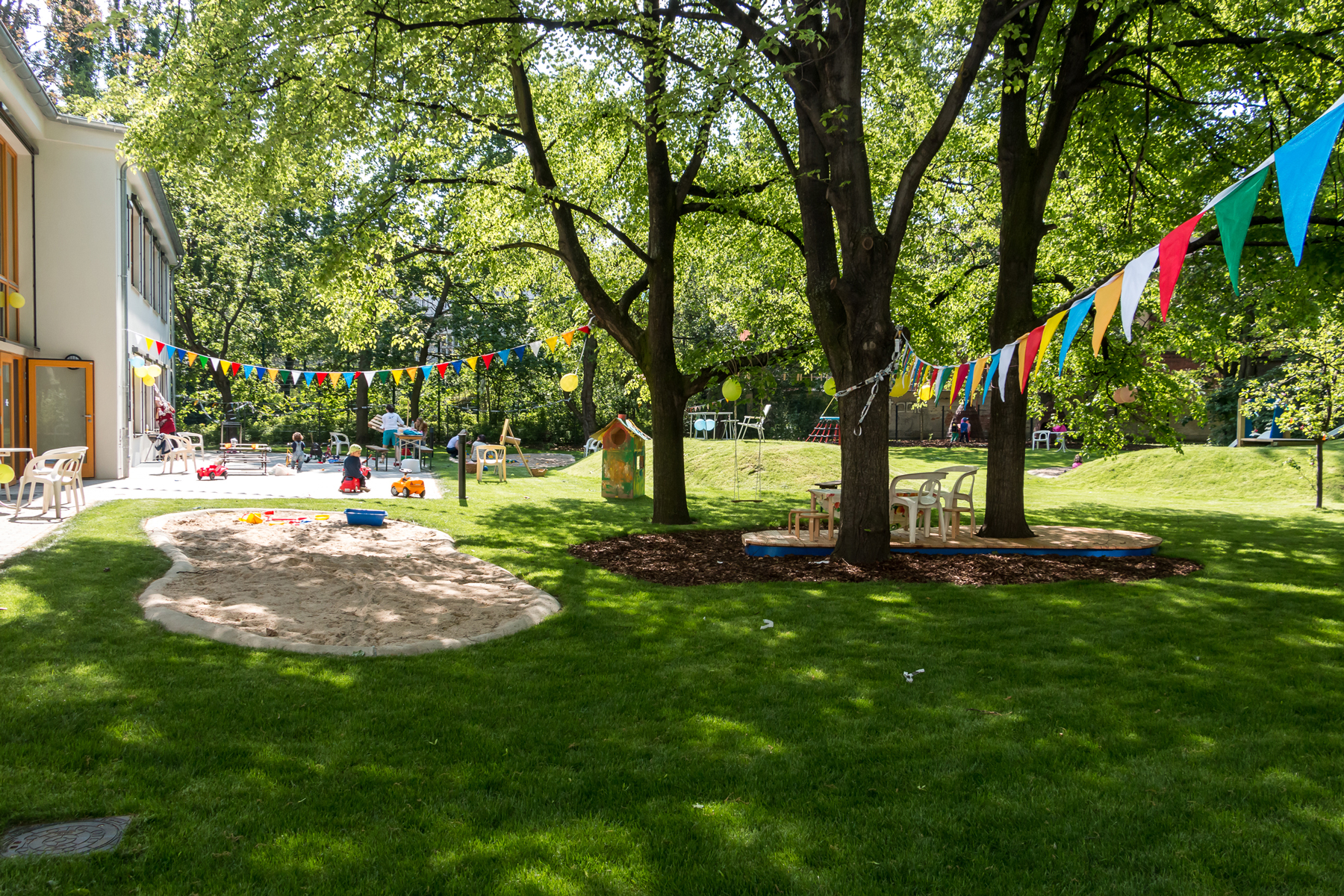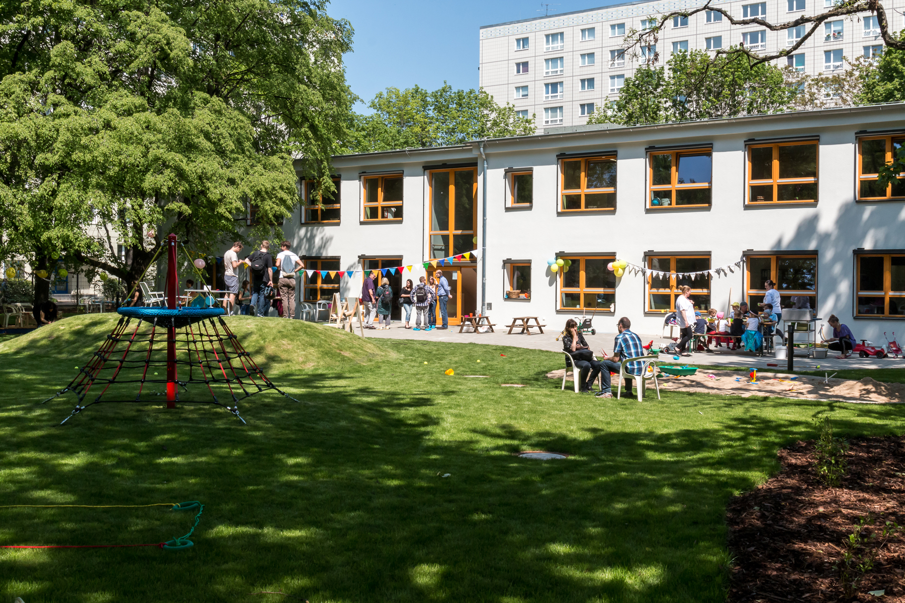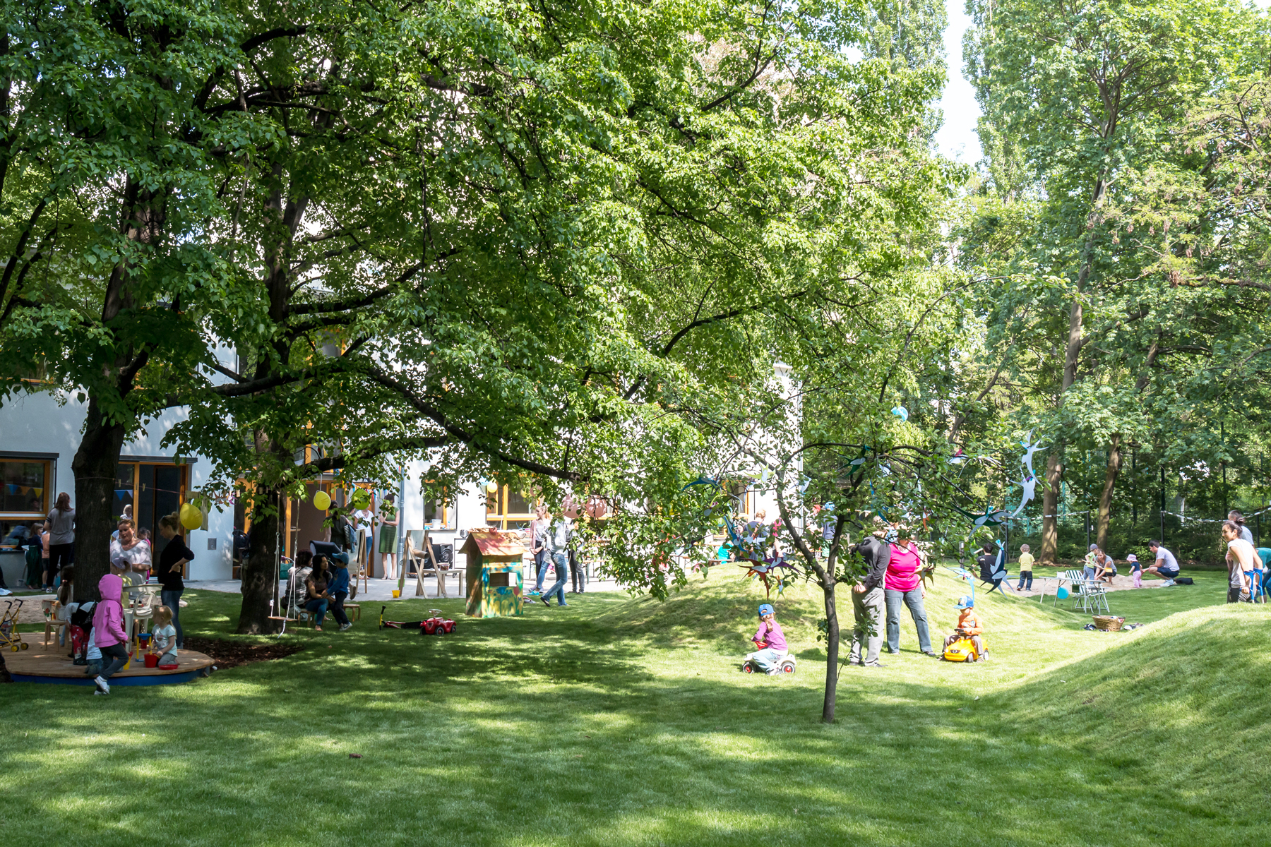 • großer Garten, Bewegungs- und Musikraum, Kreativwerkstatt mit Atelier, Erlebnisbadezimmer, „Restaurant“ zum gemeinschaftlichen