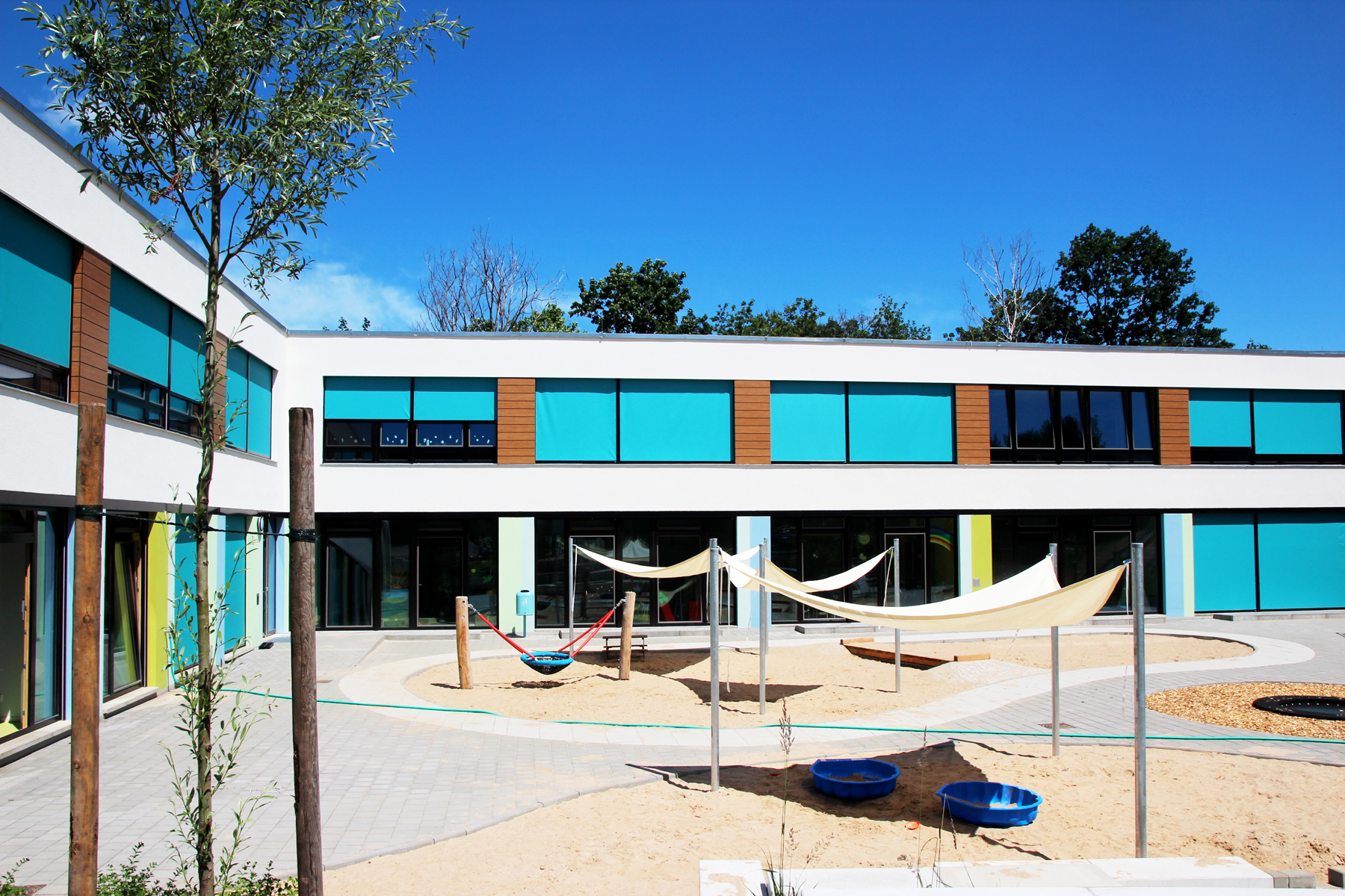 Hier können wir 119 Kinder im Alter von 6 Monaten bis zum Schuleintritt betreuen. 40 Plätze sind für Kinder unter 3 Jahren, es werden auch Kinder mit besonderen Bedarfen aufgenommen.